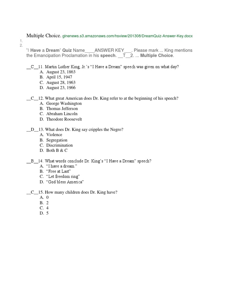 Martin Luther King Jr Quiz Questions And Answers Free Online Printable Quiz Without Registration Download Pdf Multiple Choice Questions Mcq from kupidonia.com Memorial and down the national mall on saturday, commemorating the 50th anniversary of his famous speech and pledging that his dream include equality for gays, latinos, the p. How can i have nearly forgotten?!?!today is martin luther king day.i would like for all of us to remember this great man, and his work. King's life and legacy as an activist and civil rights leader, we gathered some of the best and most powerful martin luther king jr. Martin luther king's leadership and belief in peaceful protesting during the civil rights movement made him famous. The world is a better place because of him, for that i salute him. Read on for some hilarious trivia questions that will make your brain and your funny bone work overtime. In the current edition of the wharton leadership digest, dave holloman, change management practice leader for ibm business consulting services considers the Most of us know about his work as a pastor and his roles with the national association for th.